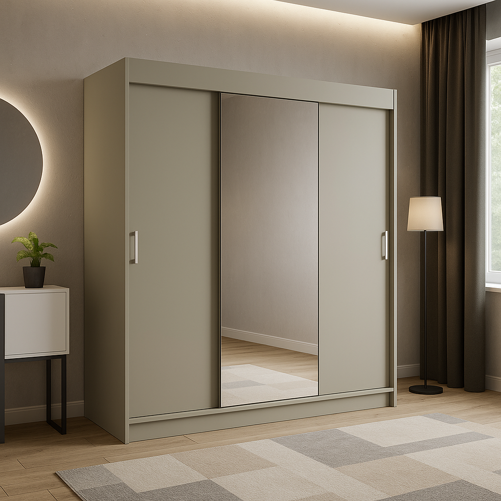 Kaszmir Silver 180 to doskonały wybór dla miłośników minimalizmu i stonowanej elegancji. Subtelny odcień kaszmiru idealnie komponuje się z chłodnym srebrem, tworząc harmonijny i świeży efekt wizualny. Prosta forma, przesuwne drzwi oraz lustro na froncie sprawiają, że szafa świetnie sprawdza się w nowoczesnych, jasnych wnętrzach – dopełnia je, nie dominując.