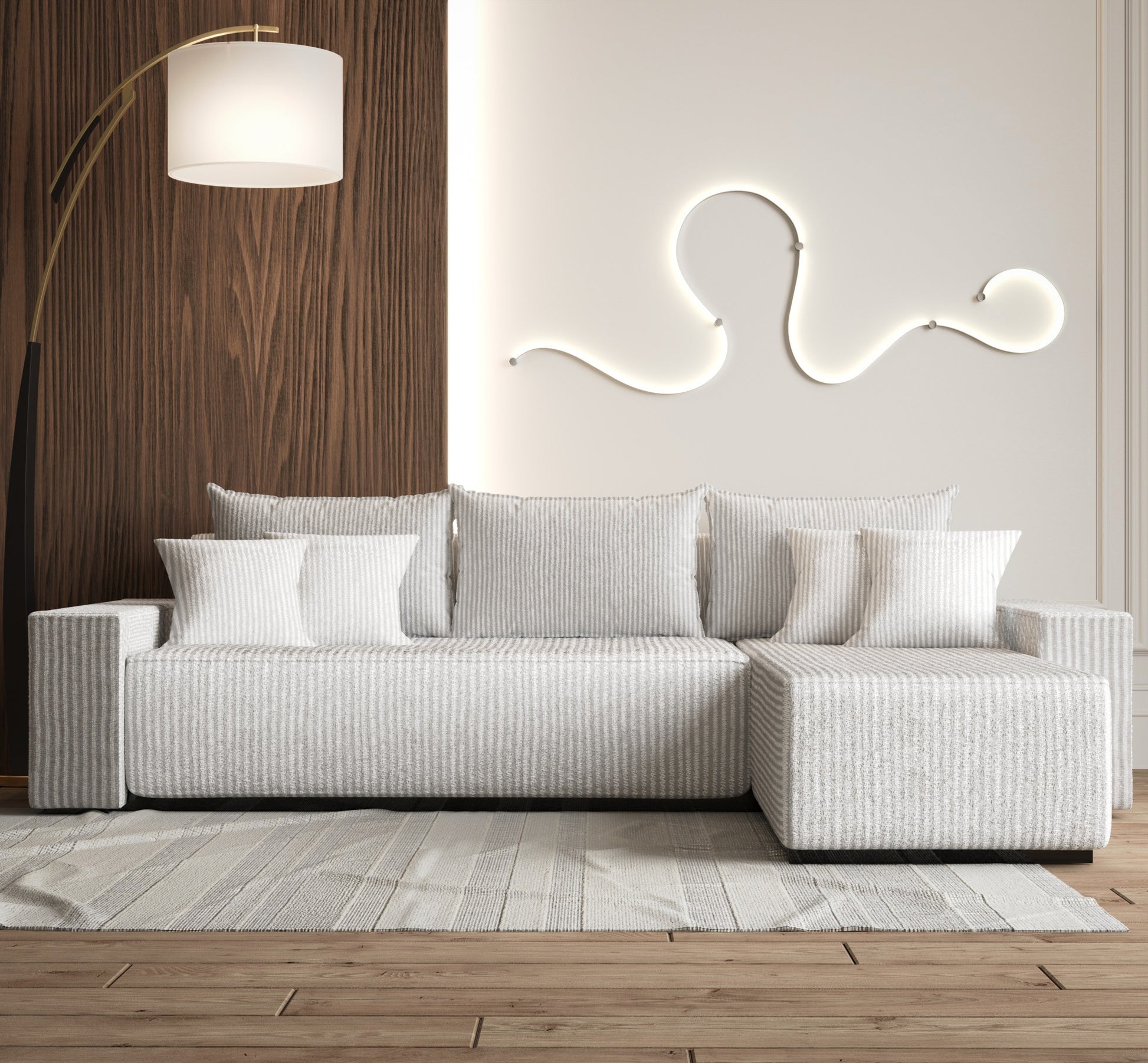 TEDEN to nowoczesny narożnik z funkcją spania, dostępny w różnych wariantach materiałów i kolorystyki. Prosta forma, wygodne poduszki i praktyczne rozwiązania sprawiają, że doskonale odnajdzie się zarówno w salonie, jak i w sypialni. Jego sztruksowe wykończenie dodaje wnętrzu przytulności, a kompaktowe wymiary pozwalają na swobodne dopasowanie do różnych przestrzeni.