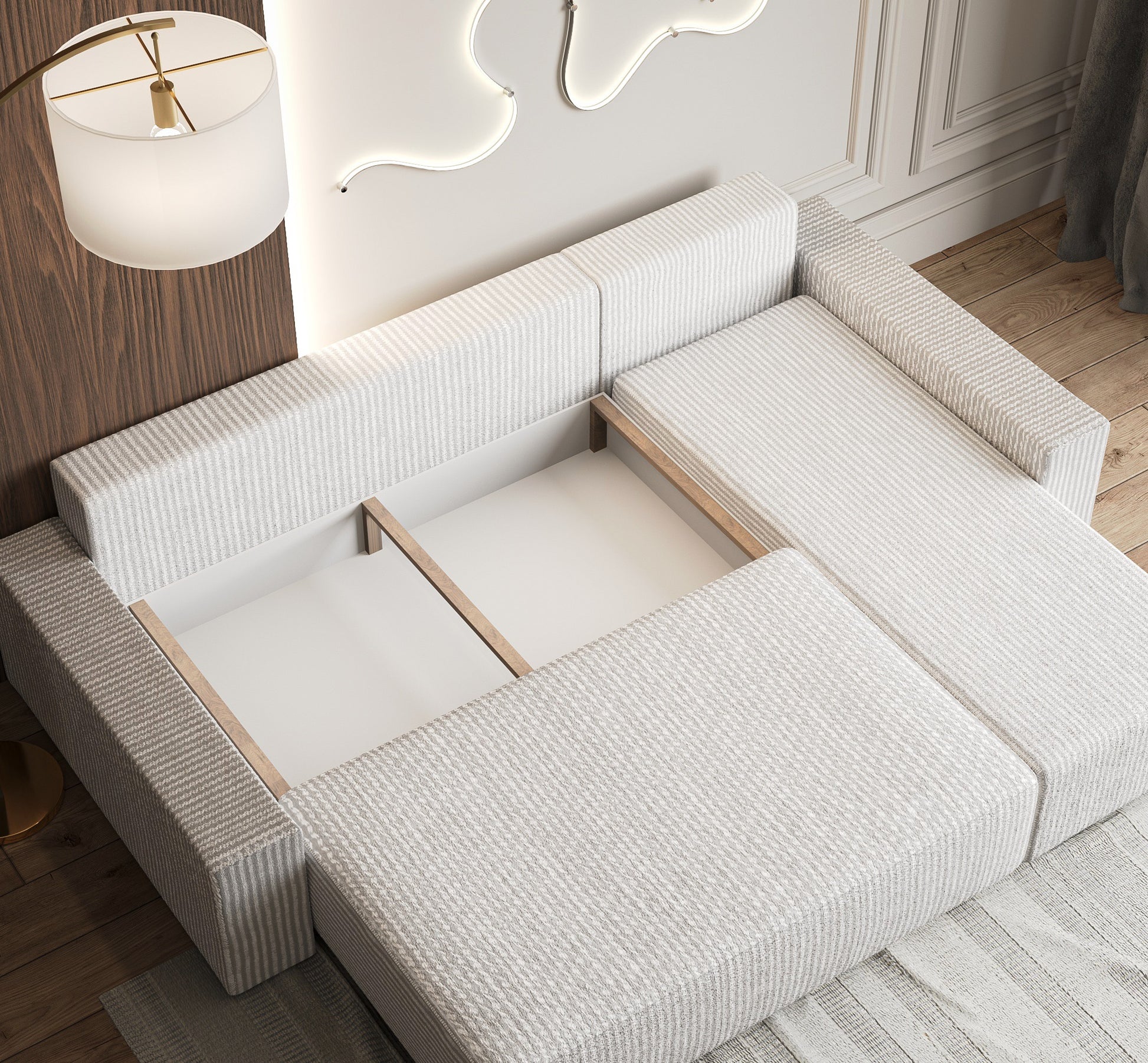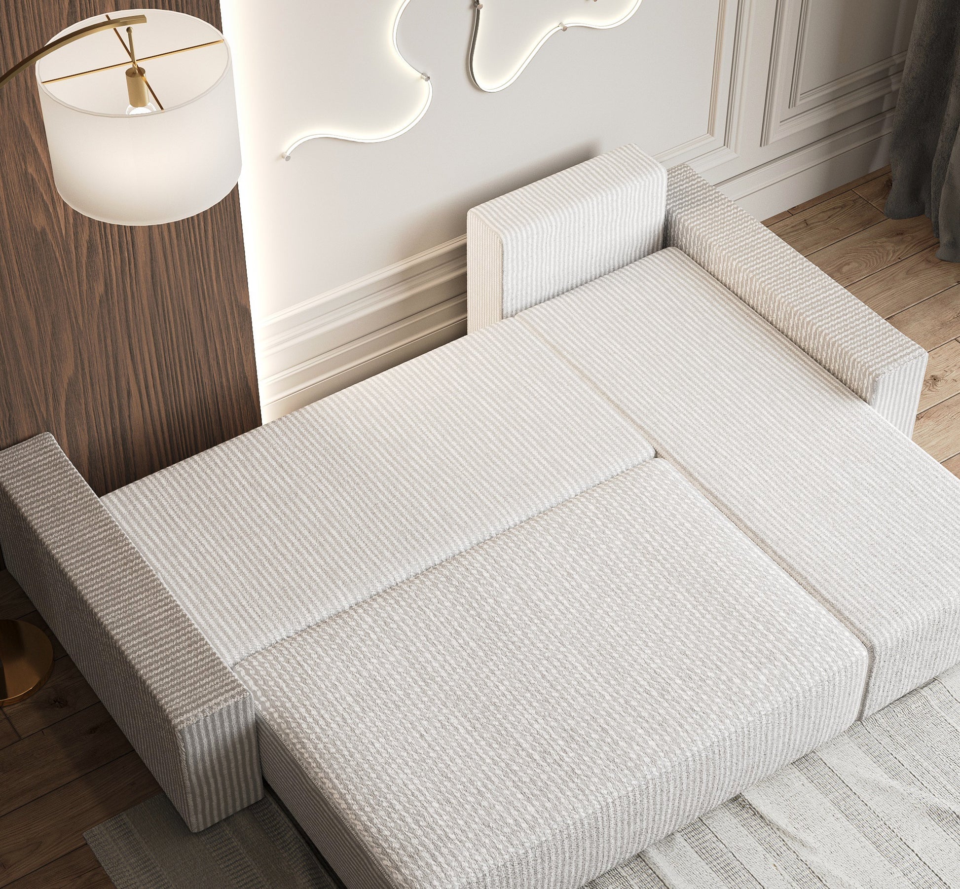 Wysokiej jakości pianka PUR w siedzisku zapewnia komfortowy wypoczynek, a duży pojemnik na pościel oraz powierzchnia spania 200 x 140 cm czynią go funkcjonalnym rozwiązaniem także na co dzień. Tył mebla wykończony został w tym samym materiale co front, co pozwala ustawić narożnik także na środku pomieszczenia.