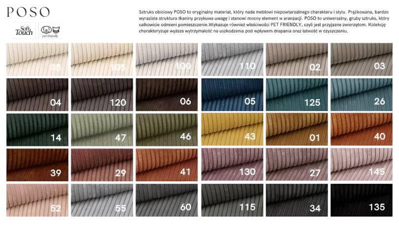 - Tapicerka: sztruks lub inny materiał – do wyboru