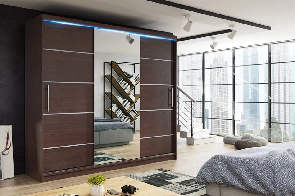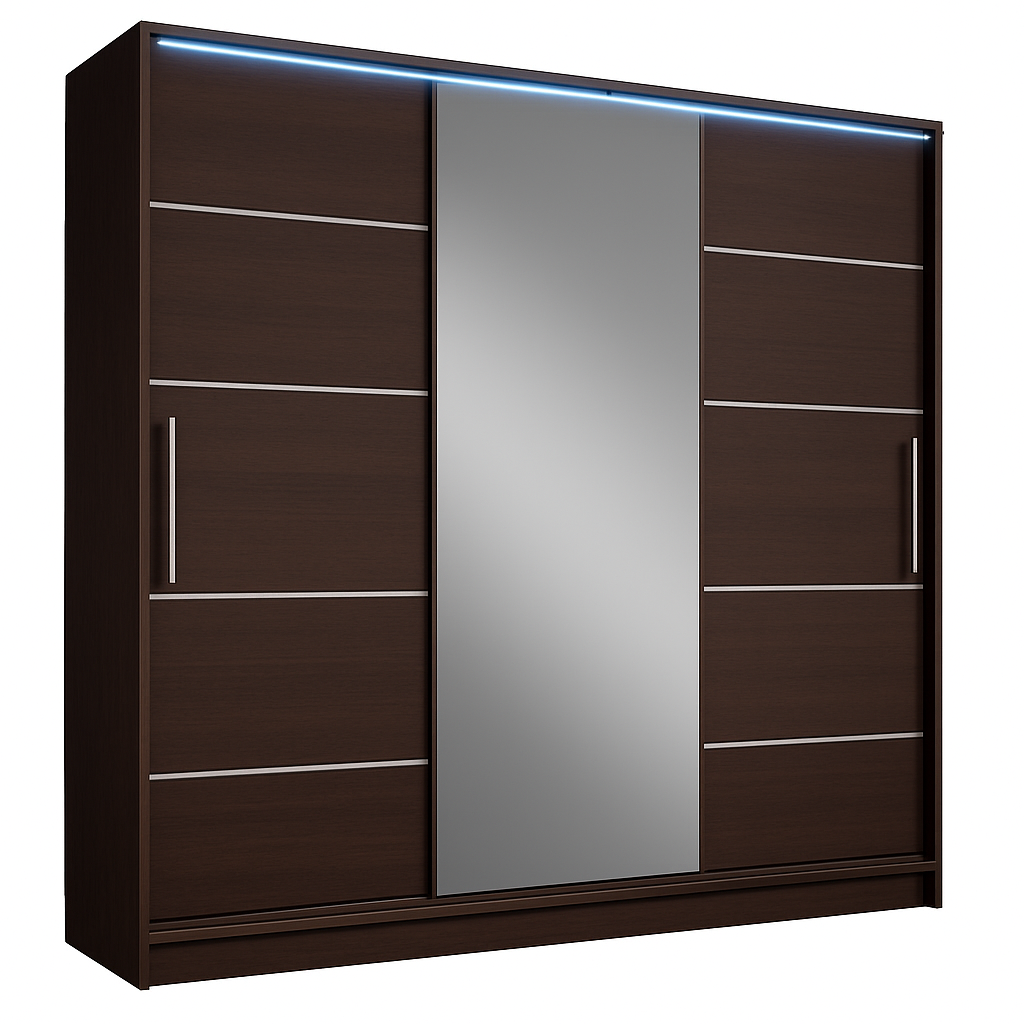 TIO3 to szafa, która łączy nowoczesny styl z praktycznymi rozwiązaniami. Dostępna w trzech uniwersalnych wariantach kolorystycznych – klasycznej bieli, ciepłej sonomie oraz głębokim wenge – z łatwością dopasuje się do każdej aranżacji. Front z dużym lustrem optycznie powiększa wnętrze, a srebrne paseczki ozdobne dodają eleganckiego wykończenia.