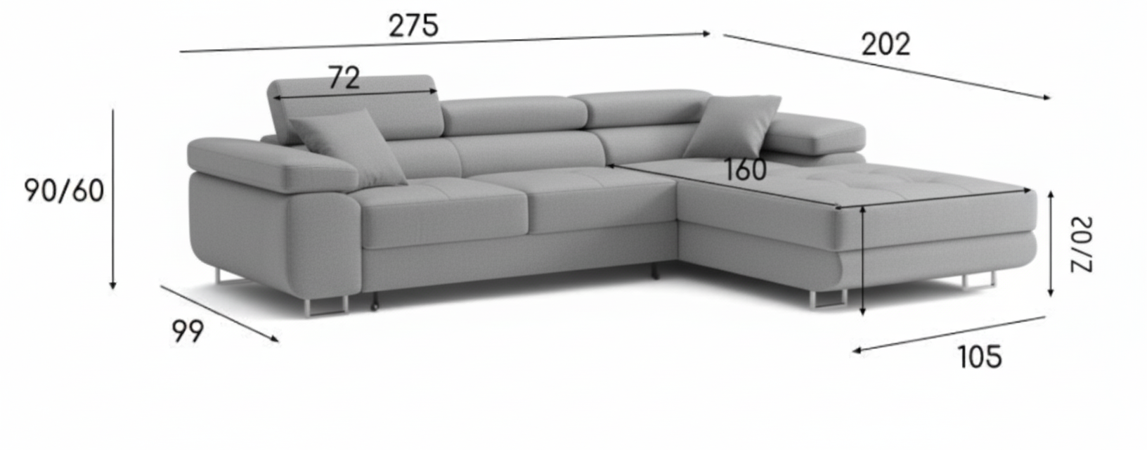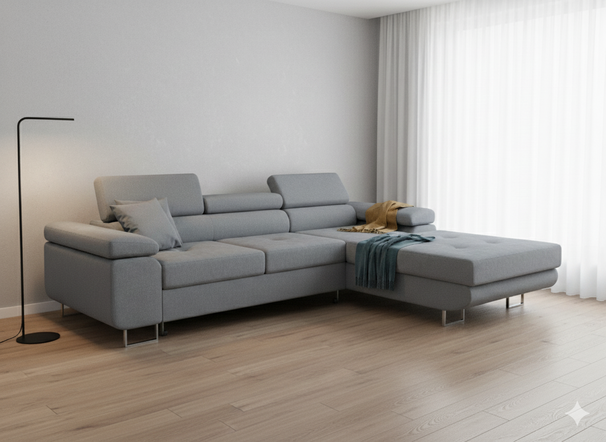 Wysokiej jakości materiały, regulowane zagłówki oraz praktyczne dodatki – takie jak pojemnik na pościel czy funkcja spania – sprawiają, że PASSANO to mebel, który nie tylko pięknie wygląda, ale też świetnie sprawdza się w codziennym użytkowaniu. Tapicerowany tył umożliwia ustawienie narożnika w dowolnym miejscu pomieszczenia, a chromowane nóżki nadają mu nowoczesnego charakteru.