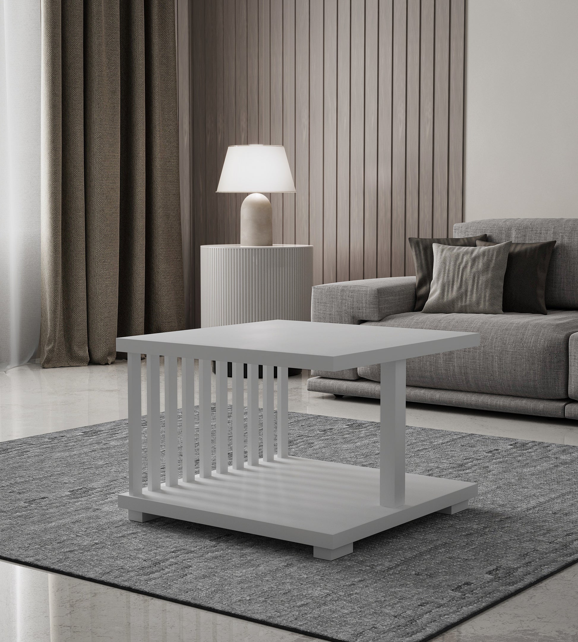 Arctic Elegance to stolik, który wnosi do wnętrza świeżość, spokój i minimalistyczną klasę. Matowa biel i geometryczna forma wzbogacona pionowymi lamelami tworzą elegancką, ponadczasową całość, idealną do jasnych i przestronnych aranżacji.
