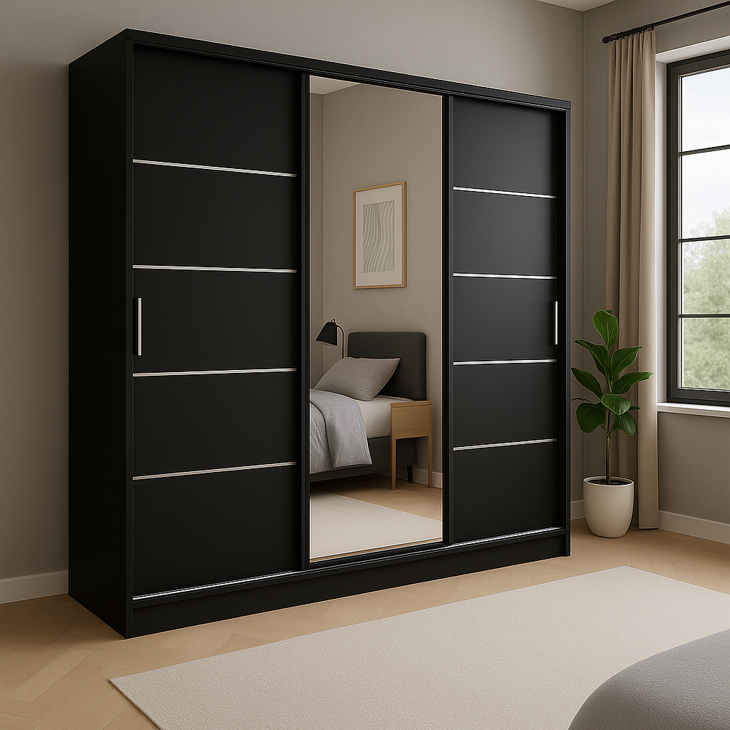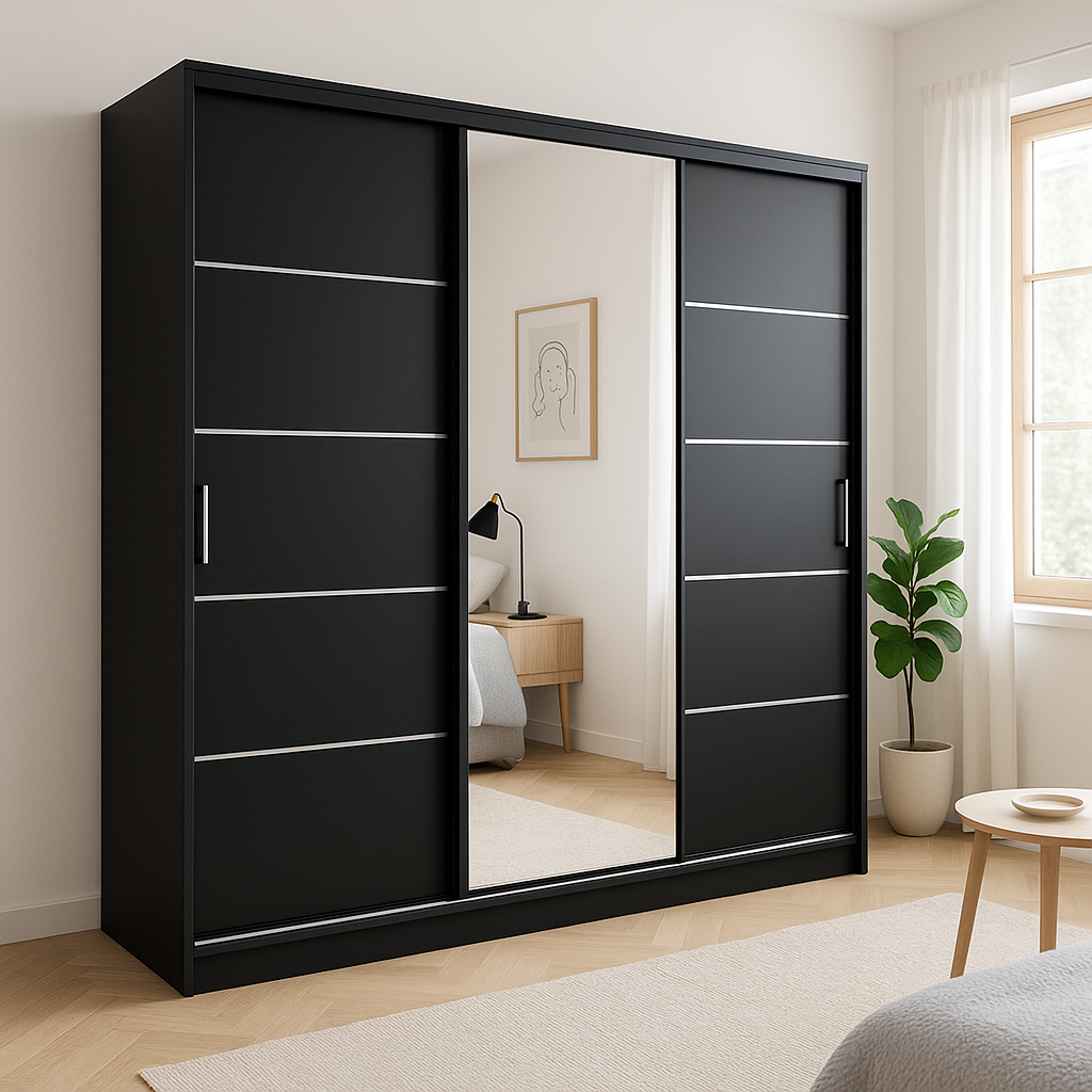Tio Black 180 Line to szafa, która łączy nowoczesną elegancję z funkcjonalnością na najwyższym poziomie. Jej wyrazista, czarna kolorystyka wprowadza do wnętrza nutę luksusu i nowoczesnego charakteru, a srebrne detale – lustro oraz subtelne paseczki ozdobne – dodają szlachetności i optycznie rozświetlają bryłę mebla.