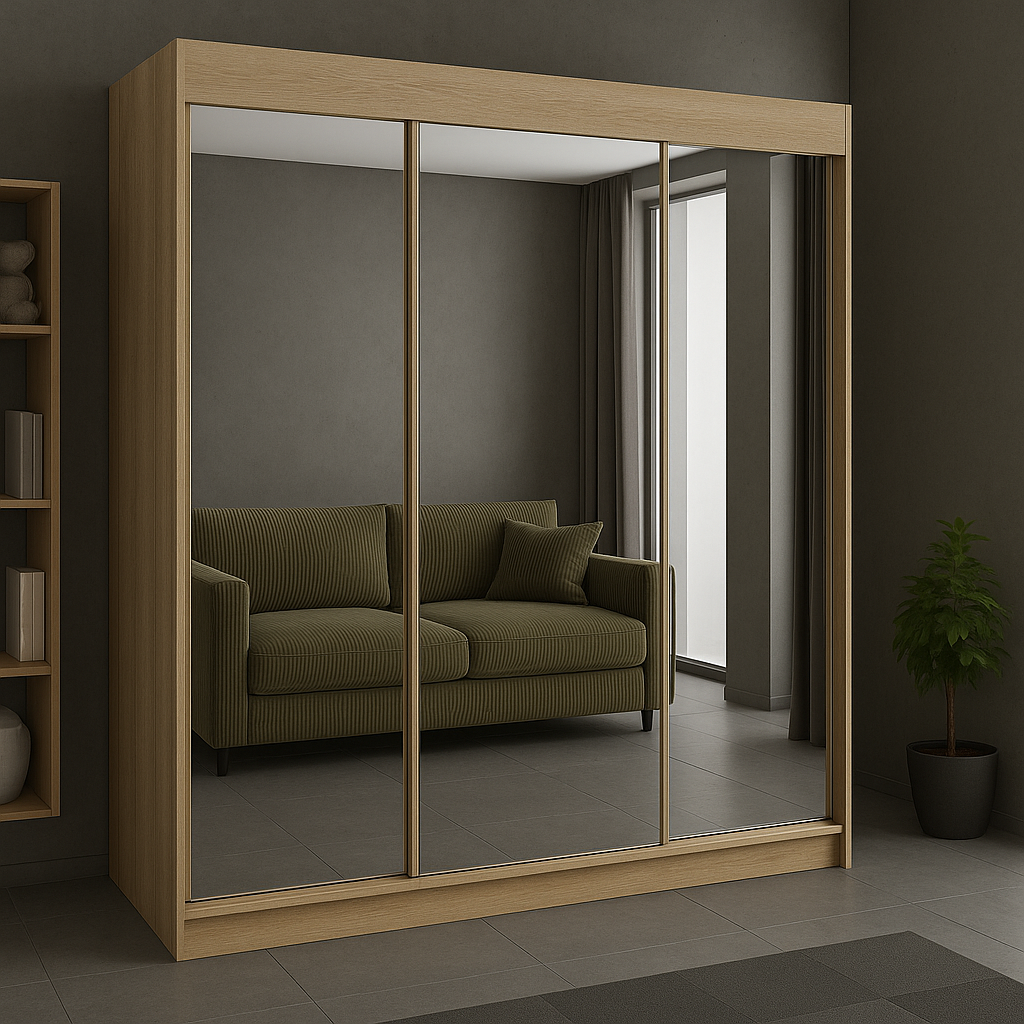 Tio 1 to minimalistyczna i stylowa szafa, która sprawdzi się w nowoczesnych i klasycznych wnętrzach. Zastosowanie dużych luster na froncie optycznie powiększa przestrzeń, a połączenie bieli z ciepłym dębem sonoma tworzy przytulny i elegancki efekt wizualny. Brak uchwytów to ukłon w stronę nowoczesnych trendów – czysta forma, maksimum funkcjonalności.
