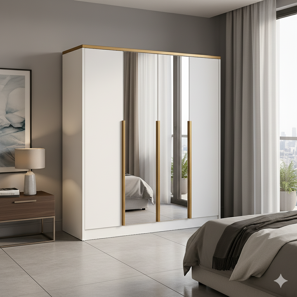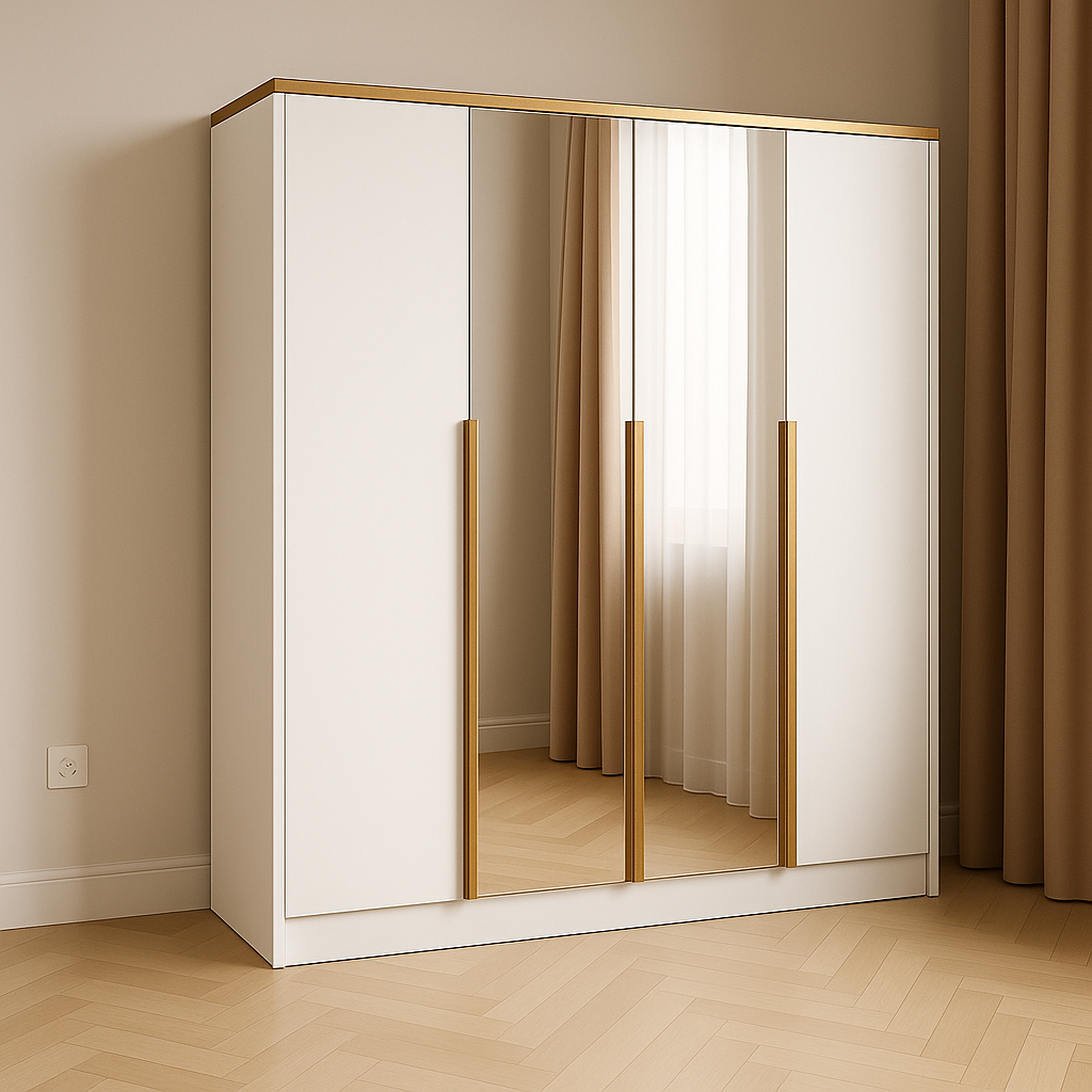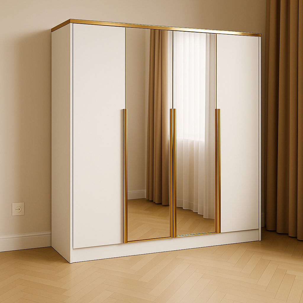 Model Tiza 200 Biała z lustrami i złotymi detalami to nowoczesna, elegancka szafa uchylna, zaprojektowana z myślą o jasnych, funkcjonalnych wnętrzach. Gładkie, białe fronty zostały wzbogacone o duże lustra umieszczone centralnie, które optycznie powiększają przestrzeń i dodają jej lekkości. Całość dopełniają wysokie, złote uchwyty listwowe, które nadają szafie wyjątkowego charakteru. Idealna do sypialni, garderoby, przedpokoju lub pokoju młodzieżowego – dzięki szerokości 200 cm i klasycznym drzwiom uchylnym zapewnia wygodny dostęp do całej zawartości.